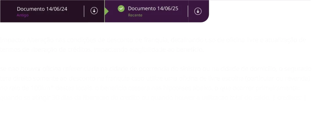 Comparativos lado a lado do que mudou de uma versão nova para a anterior com cada seguradora